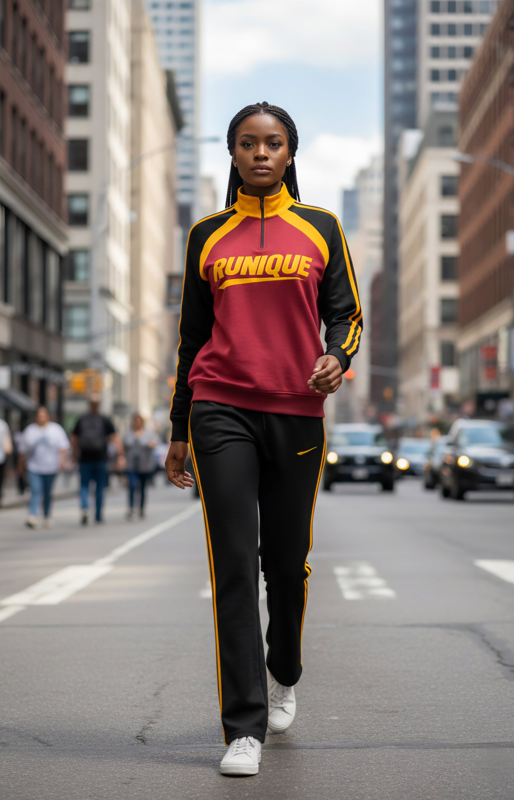 The top features a bold crimson and gold color-block design with a smooth half-zip finish, highlighted by the iconic RUNIQUE logo across the chest for a powerful identity. The matching black pants come with dual gold side stripes and a sleek embroidered detail, giving you a sharp, athletic silhouette.